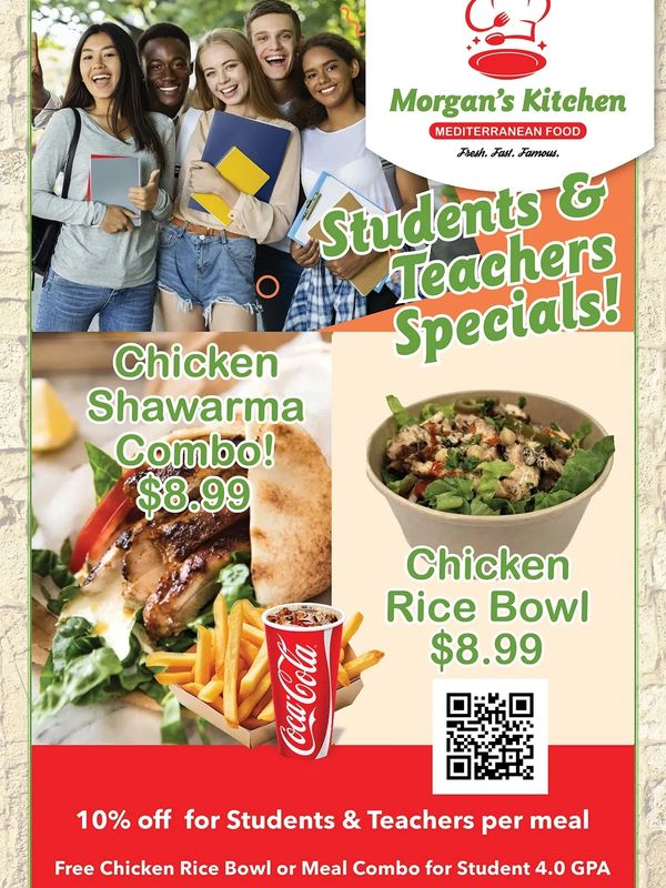 Chicken shawarma pita + drink or water + 1 side (fries, rice or salad) per students. Monday to Friday